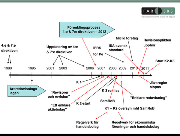 Tidsaxel här brevid visar hur de olika utredningarna står i förhållande till varandra i tid samt i viss mån hur de kommer att påverkas av varandra. EU:s förenklingsprocess av fjärde och sjunde bolagsdirektiven (Simplifikation of 4:th and 7:th Company Law Directives) som är en del i arbete med att stärka de europeiska företagens konkurrenskraft, påbörjades i december 2006 och ska vara klar senast 2012. Direktiven, som antogs runt 1980, anses förlegade och omoderna varför de nu ska skrivas om och tidsanpassas. I detta arbete ses bland annat gränsvärdena över för vilka företag som framöver ska tillämpa direktiven. Kommissionen har tillsatt en särskild arbetsgrupp (Stoiber-gruppen) för detta avseende och gruppen har bland annat lämnat förslag om definition av «micro-företag» vilka föreslås undantas från kravet att tillämpa det 4:e direktivet. Vilket skulle ge medlemsländer rätt att undanta vissa företag från kravet att offentliggöra sin finansiella rapportering. Stoiber-gruppens samlade förslag beräknas ge besparingar på uppemot 5,6 miljarder euro.