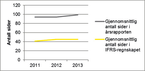Illustrasjonen ovenfor viser at gjennomsnittlig antall sider i årsrapporten var 100 sider, mens årsregnskapene i gjennomsnitt var 45 sider. For å sette dette i perspektiv kan det nevnes at årsrapportene før overgangen til IFRS i gjennomsnitt var på 45 sider. Mulige konsekvenser fra økning i antall sider er at den relevante informasjonen blir vanskelig tilgjengelig og at regnskapsbrukerne ikke klarer å identifisere all beslutningsnyttig informasjon.
