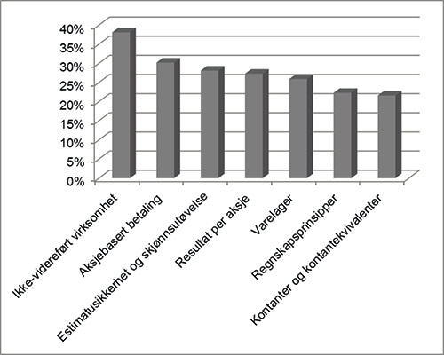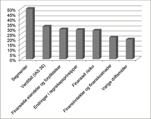 Blant de syv mest brukte notene finner vi ingen store overraskelser. Derimot synes vi det er interessant å observere at både tilleggsinformasjon om (1) estimatusikkerhet og skjønnsutøvelse og (2) kontanter og kontantekvivalenter figurerer på listen over de minst brukte notene.