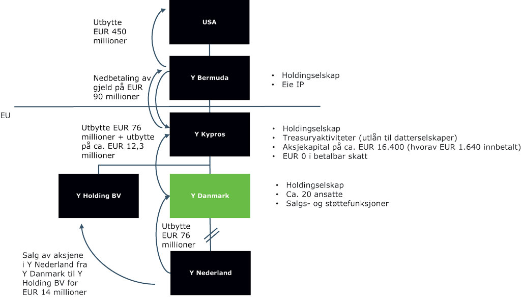 Det ble i løpet av en kort tidsperiode utført en rekke konserninterne transaksjoner som blant annet resulterte i at et utbytte på nærmere EUR 90 millioner ble utdelt fra Danmark uten at det ble betalt kildeskatt. Y Bermuda stiftet først et kypriotisk holdingsselskap, Y Kypros, og solgte sine aksjer i Y Danmark til det kypriotiske selskapet for en selgerkreditt på EUR 90 millioner. Deretter ble det utbetalt et utbytte på EUR 76 millioner fra et nederlandsk datterselskap til Y Danmark, videre til Y Kypros. Det kypriotiske selskapet brukte pengene til å nedbetale selgerkreditten til Y Bermuda. I tillegg stiftet Y Kypros et holdingselskap som kjøpte aksjer fra Y Danmark. Store deler av denne kjøpesummen på EUR 14 millioner ble senere delt ut som utbytte til Y Kypros.