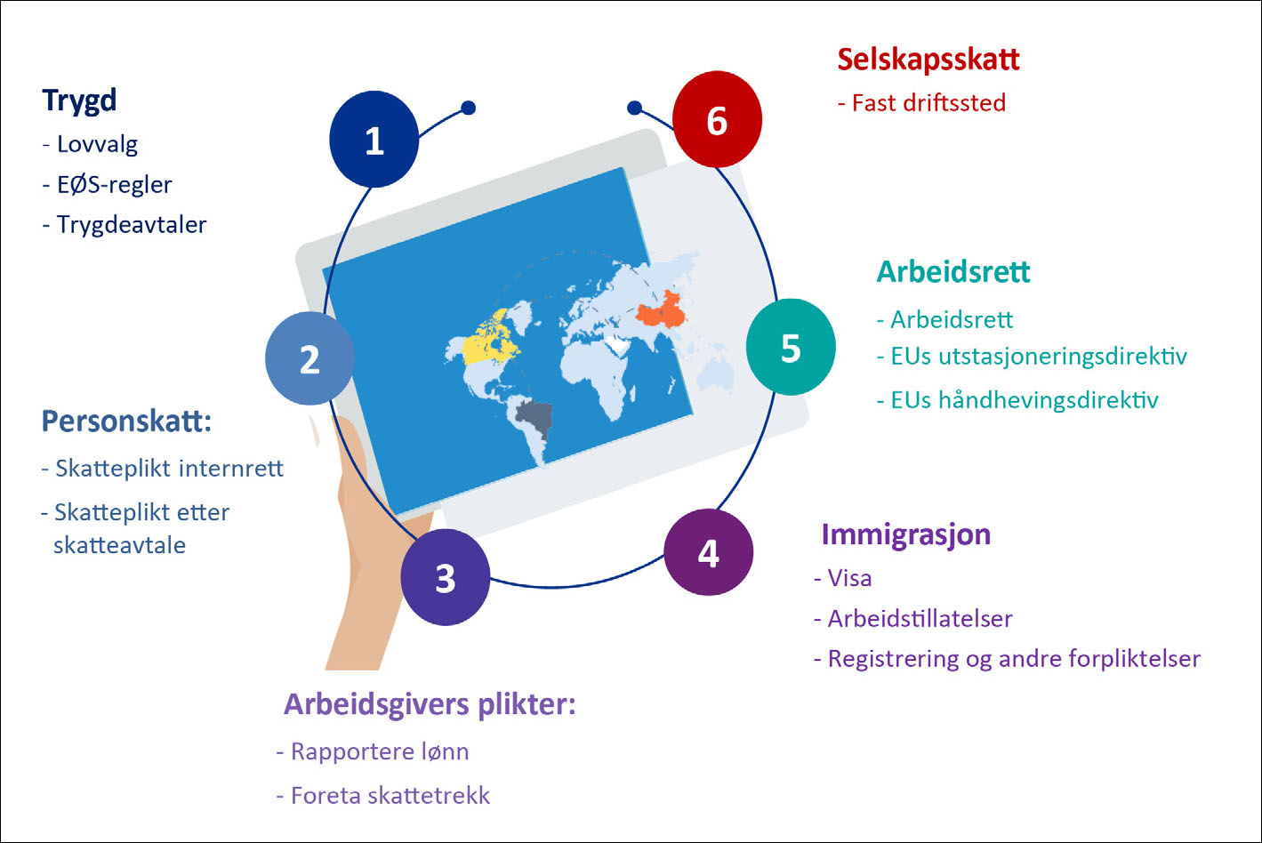 Figuren under viser en generell oversikt over hva som bør vurderes dersom ansatte får mulighet til å utføre arbeid i utlandet.