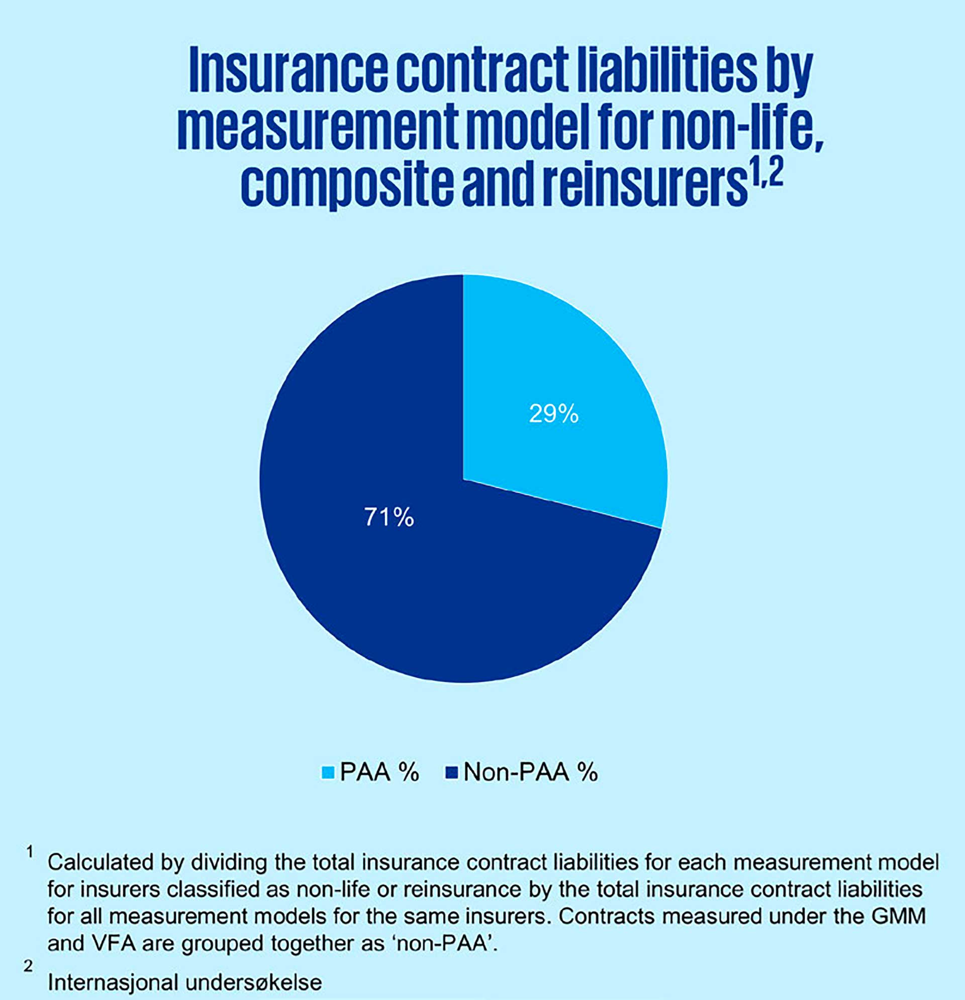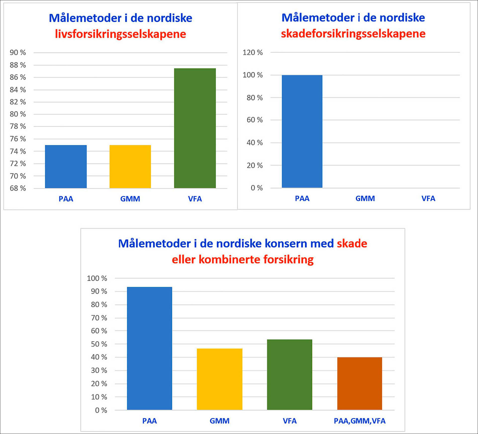 I den nordiske undersøkelsen har alle skadeforsikringsselskapene valgt å benytte seg av den forenklede PAA-metoden for de fleste av sine forsikringskontrakter. For livsforsikringsselskapene er det naturlig nok større variasjon i valg av metode, hvor VFA i hovedsak er benyttet på pensjonsprodukter med betydelige investeringskomponenter. PAA er benyttet på kontrakter med dekningsperiode under ett år og GMM er benyttet på resterende kontrakter.
