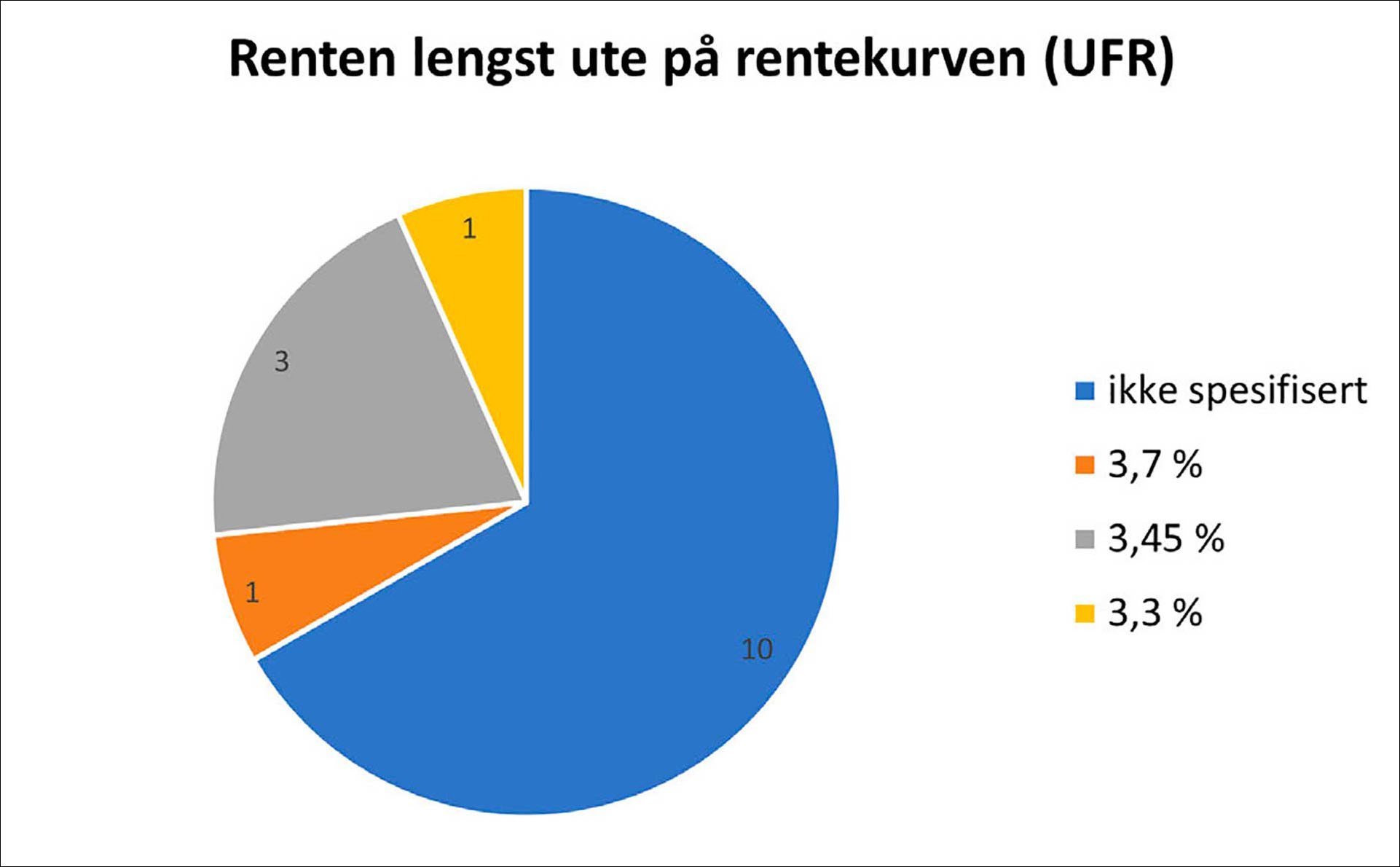 Renten lengst ute på rentekurven var generelt basert på langsiktige renter og inflasjonsrater eller hentet fra et regulatorisk rammeverk. Blant de nordiske selskapene var EIOPAs fastsatte UFR mest brukt blant dem som har gitt denne informasjonen: 3,45 %.