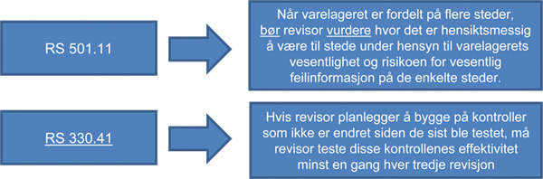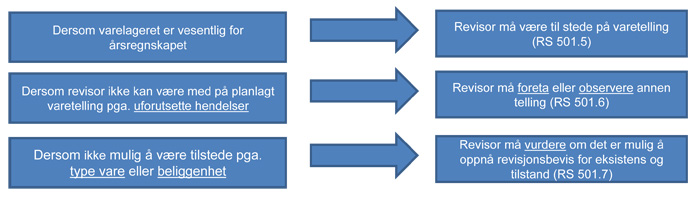 I RS 501R fremkommer de tilsvarende kravene slik: Dersom vesentlig punkt 4, dersom det oppstår uforutsette hendelser punkt 6 og dersom upraktisk (impracticable) punkt 7 og vedlegg punkt A12-A14. Slik vi tolker dette, er det kun faktorer som type vare eller varens beliggenhet som kan resultere i at revisor ikke behøver å være til stede på varetelling. I slike tilfeller sier standarden klart at revisor må vurdere om det fortsatt er mulig å konkludere på eksistens og tilstand. Det er altså ikke sikkert at det kan konkluderes med ren revisjonsberetning hvis revisor ikke har vært til stede på varetelling. Dette unntaket er ikke relevant å bruke i de tilfellene varelagerets beliggenhet ligger langt unna revisors kontor. Dette presiseres tydelig i RS 501R som sier klart at faktorer som upassende, tidkrevende, vanskelig eller kostbart ikke er akseptable som begrunnelse for ikke å delta på varetelling (RS 501R A12). Slik vi tolker dette unntaket, er det kun hvis varens beliggenhet gjør det umulig, for eksempel hvis varen ligger under vann. Når det gjelder type vare, så siktes det til varer som ikke lar seg fysisk telle, for eksempel oljereserver og oppdrettsfisk. I revidert RS 501 beskrives en situasjon der varen kan ligge plassert slik at det kan utgjøre fare for revisor å være til stede som eksempel på dette unntaket (RS 501R A12). I slike tilfeller må altså revisor vurdere om andre revisjonshandlinger vil kunne gi betryggende sikkerhet for eksistens og tilstand. Forhold som at deltakelse på varetelling er upassende, vanskelig, tidkrevende eller dyrt, er altså ikke i seg selv noen akseptabel argumentasjon for å kunne slippe å delta på varetelling. Vi har erfaring med at revisorer har trukket seg fra oppdraget med den begrunnelsen at varelageret ligger for langt unna revisors kontor slik at kostnaden ved å delta på varetelling blir for stor, samtidig som ikke å delta på varetellingen ikke er forenlig med god revisjonsskikk.