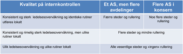 Bestemmelsen i RS-ene gjelder utelukkende pr. selskap. Altså kan man benytte seg av disse bestemmelsene i en totalvurdering av om man skal være til stede på alle varetellingene i et selskap med flere varelagre. RS 501 sier at det i en situasjon med flere varelagre ikke lenger er noen plikt til å delta på alle varetellingene, men revisor må vurdere om dette er hensiktsmessig. Så lenge varelager ikke er en særskilt risiko for foretaket, åpner også RS 330 for å rullere test av kontrollene. Vi mener at muligheten for ikke å være til stede på alle varetellingene ligger i å gå veien om å teste internkontrollen. Vi vil bruke følgende tabell som grunnlag for videre drøftelse: