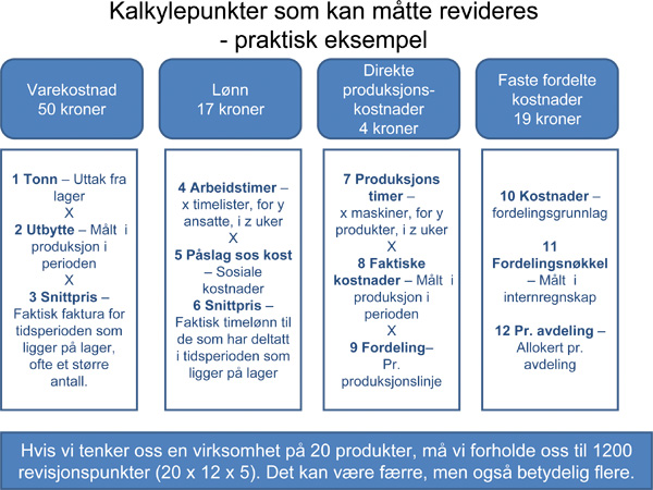 Som det fremgår av figuren, er det helt avgjørende å ha kontroll på varekostnaden som utgjør det største elementet i kalkylen. Altså må revisor ha tilstrekkelige revisjonsbevis for tonn, utbytte og pris. I tillegg vil det kreve at revisor har god kontroll på lønn og faste fordelte kostnader. Altså må revisor ha tilstrekkelig revisjonsbevis av arbeidstimer, påslaget på timer, faktisk lønnskostnad, faste kostnader, fordelingsnøkkelen på faste kostnader og fordelingen pr. avdeling. I vårt eksempel vil det kun være direkte produksjonskostnader som ville kunne revideres ved rimelighetsvurdering pga. at beløpet er uvesentlig for totalverdien i kalkylen. Vår påstand er at det gir uforholdsmessig mye jobbing å revidere kalkylen basert på substanstesting ved test av detaljer. Vi er helt overbevist om at det i de fleste situasjoner er mest hensiktsmessig å revidere ved test av kontroller. Da vil det igjen være helt avgjørende at revisor forstår virksomheten, driverne i produksjonen og kan kartlegge og teste kontrollene som er etablerte i foretaket.