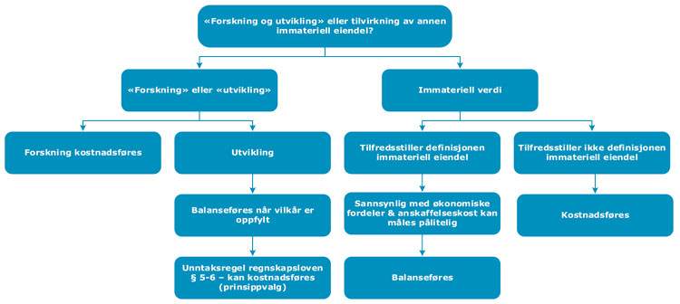 Regnskapsloven skiller mellom «forskning og utvikling» og «konsesjoner, patenter, varemerker og lignende rettigheter», heretter referert til som «rettigheter mv.». Skillet mellom egen tilvirkning av immaterielle eiendeler og «forskning og utvikling» benyttes også i internasjonal regnskapsregulering. Det er flere grunner til at dette skillet er viktig: