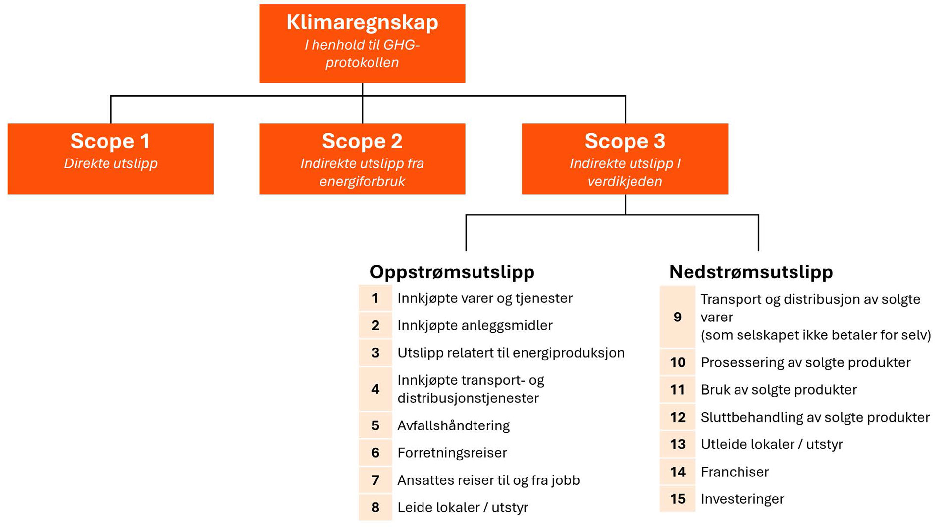 GHG-protokollen deler virksomheters klimagassutslipp inn i scope 1, 2 og 3. Inndelingen gjør det mulig å skille mellom virksomhetens direkte utslipp (scope 1), utslipp som oppstår i produksjon av innkjøpt energi (scope 2), og øvrige indirekte utslipp som skjer hos andre aktører i verdikjeden, men som likevel er et resultat av virksomhetens aktivitet (scope 3). Denne strukturen bidrar både til å synliggjøre ansvar og påvirkningsmuligheter, og til å gjøre klimaregnskap sammenlignbare.