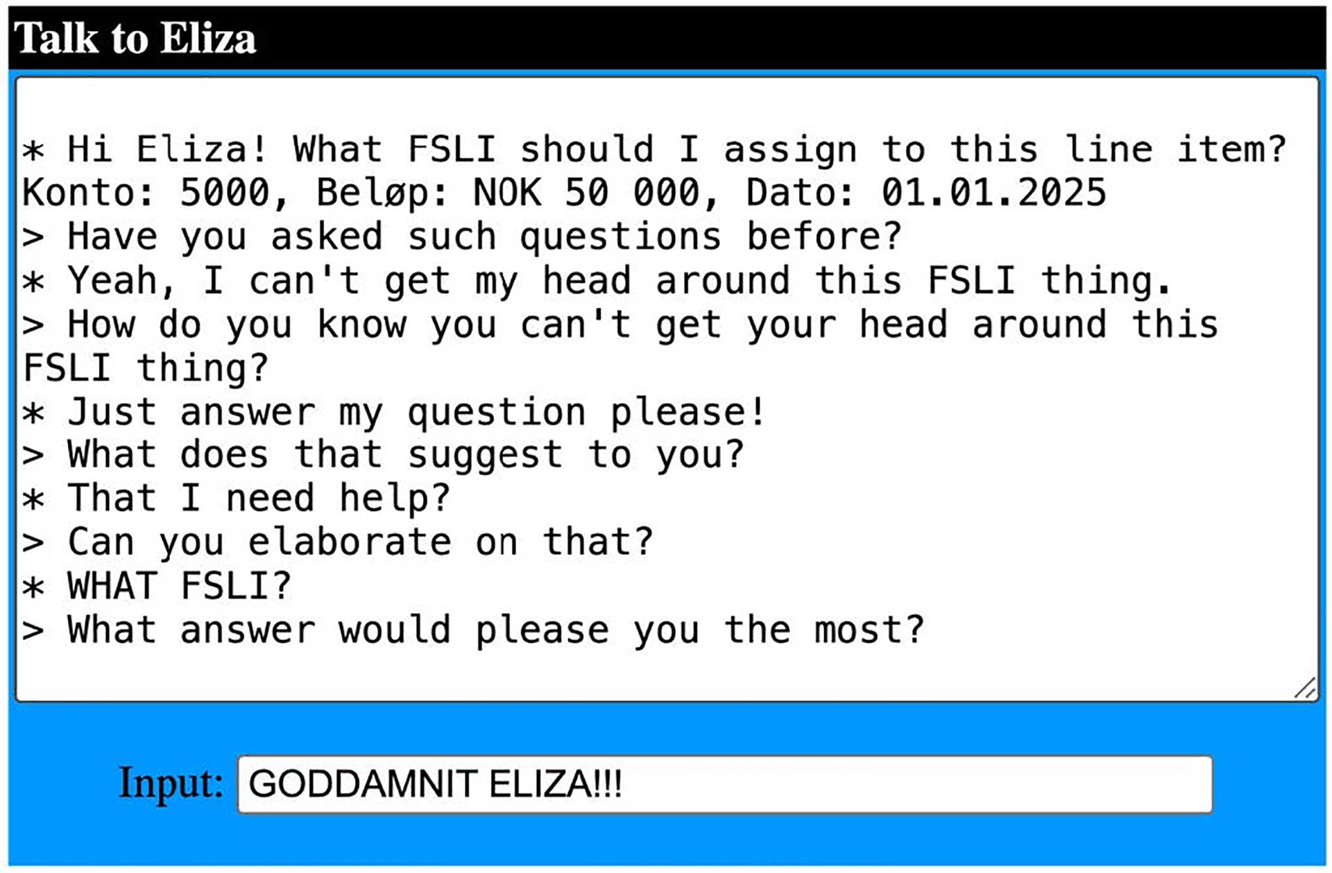 For en kjapp coaching-samtale med ELIZA var dette ofte tilstrekkelig til å gi inntrykket av intelligens, og kanskje gi en slags verdi til samtalepartneren? For en nyansatt revisor stilt overfor et faglig spørsmål, ville det imidlertid neppe være mye hjelp å hente fra ELIZAs «Hva føler du selv»-tilnærming til alle innkommende spørsmål, jf. figur 1 nedenfor.