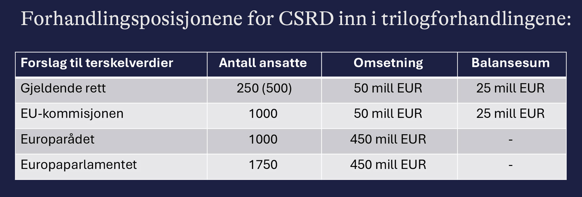 EU-kommisjonen fremmet 26. februar sitt forslag om endringer i bærekraftsrapporteringsdirektivet CSRD, mens Europarådet vedtok sin forhandlingsposisjon før sommeren, og Europaparlamentet vedtok sin forhandlingsposisjon 13. november. Neste skritt er trilogforhandlingene mellom kommisjonen, rådet og parlamentet, som startet 18. november med målsetning om endelig avklaring innen utgangen av 2025. Dette gjelder selve innholdsdirektivet, herunder terskelverdiene som avgjør hvilke foretak som skal være omfattet av CSRD.